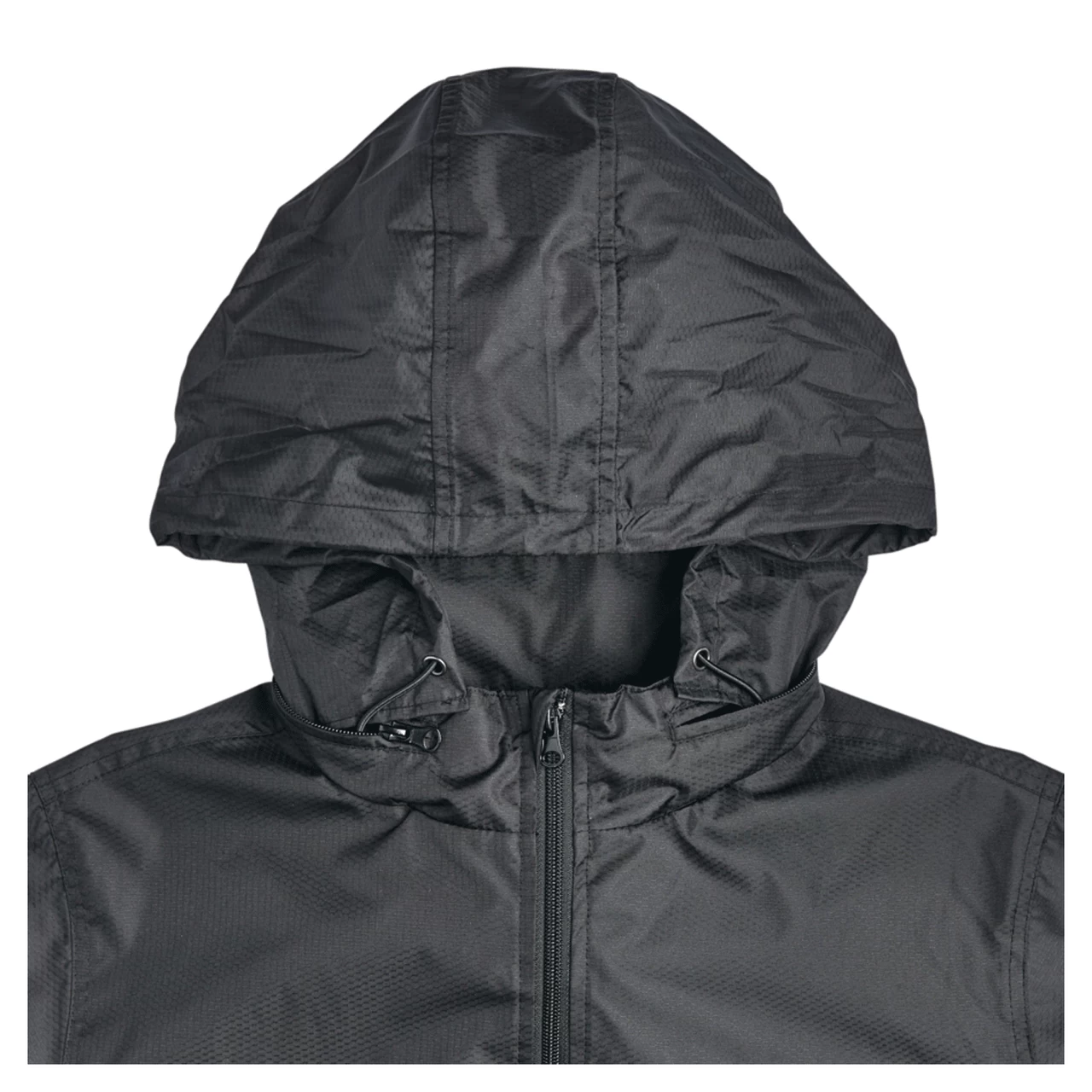 Regular fit custom zip windbreaker with water resistant coating on nylon honeycomb ripstop shell, msh lining, full zip front zipper opening, concealed stash away hood tucks into collar, vent at back body panel for breathability, set-in zipper hand pockets, drawcord hem, elastic sleeve opening, left and right Santa Cruz Strip tonal sleeve prints, small Santa Cruz logo at back neck loop.