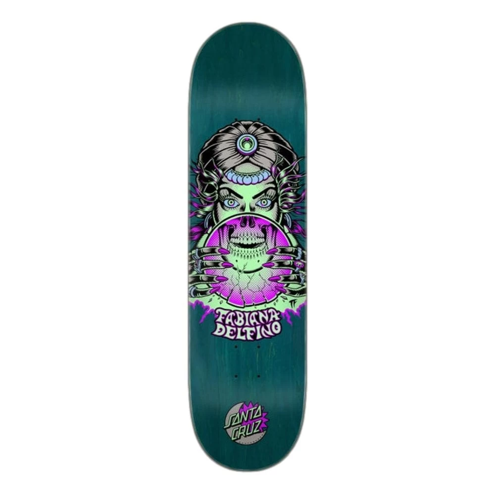 Santa Cruz Skateboards Fabiana Delfino Fortune Teller Glow VX Deck featuring glow-in-the-dark spot gloss graphic art by Thomas Fernández @liveradstudios. VX decks are thinner, stronger, and have more pop than standard 7-ply decks featuring 5 plies of North American Maple and 2 layers of Quad X technology.