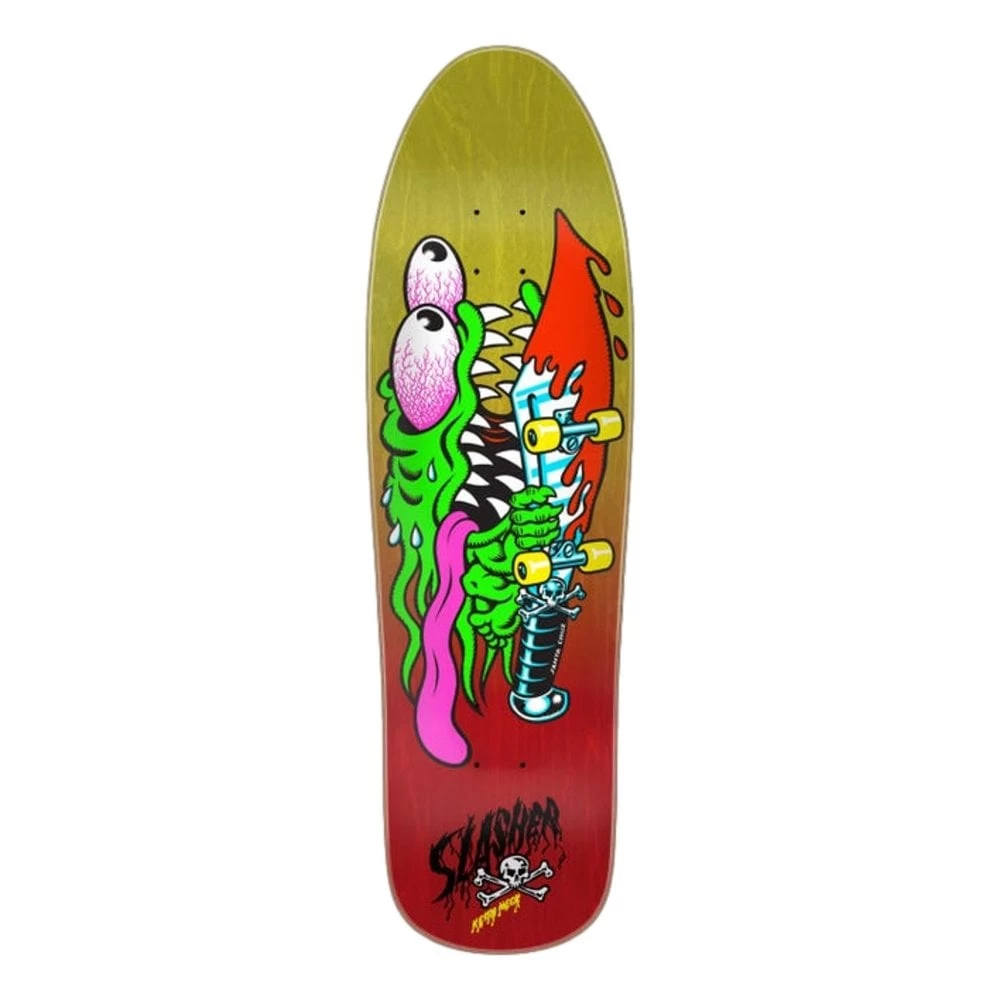 Santa Cruz Skateboards Keith Meek Slasher shaped deck featuring Meekster’s newest modernized shape with front wheel well on 7-ply North American Maple pressed individually using epoxy making a strong, responsive deck with long-lasting pop and consistent concave and kick.