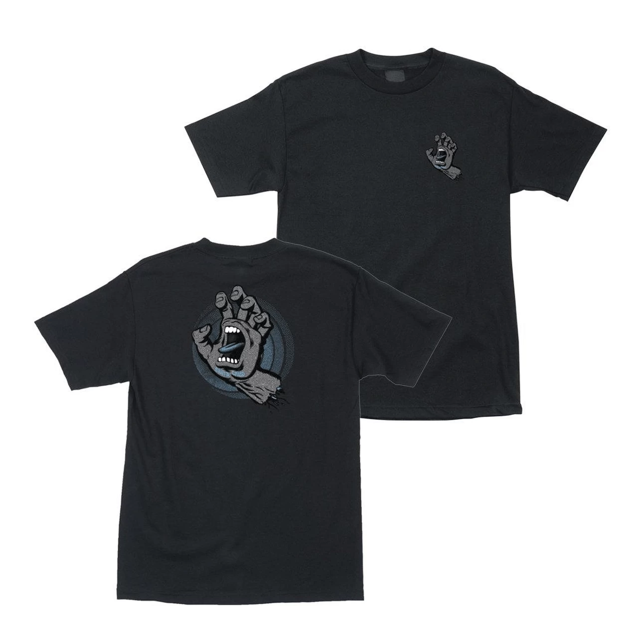 Regular fit short sleeve 6 oz. jersey t-shirt with medium front and large back Santa Cruz Amoeba Hand soft hand ink logo prints.