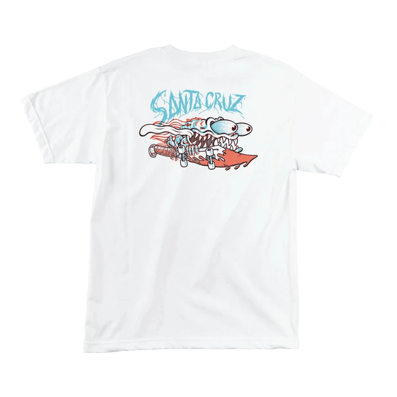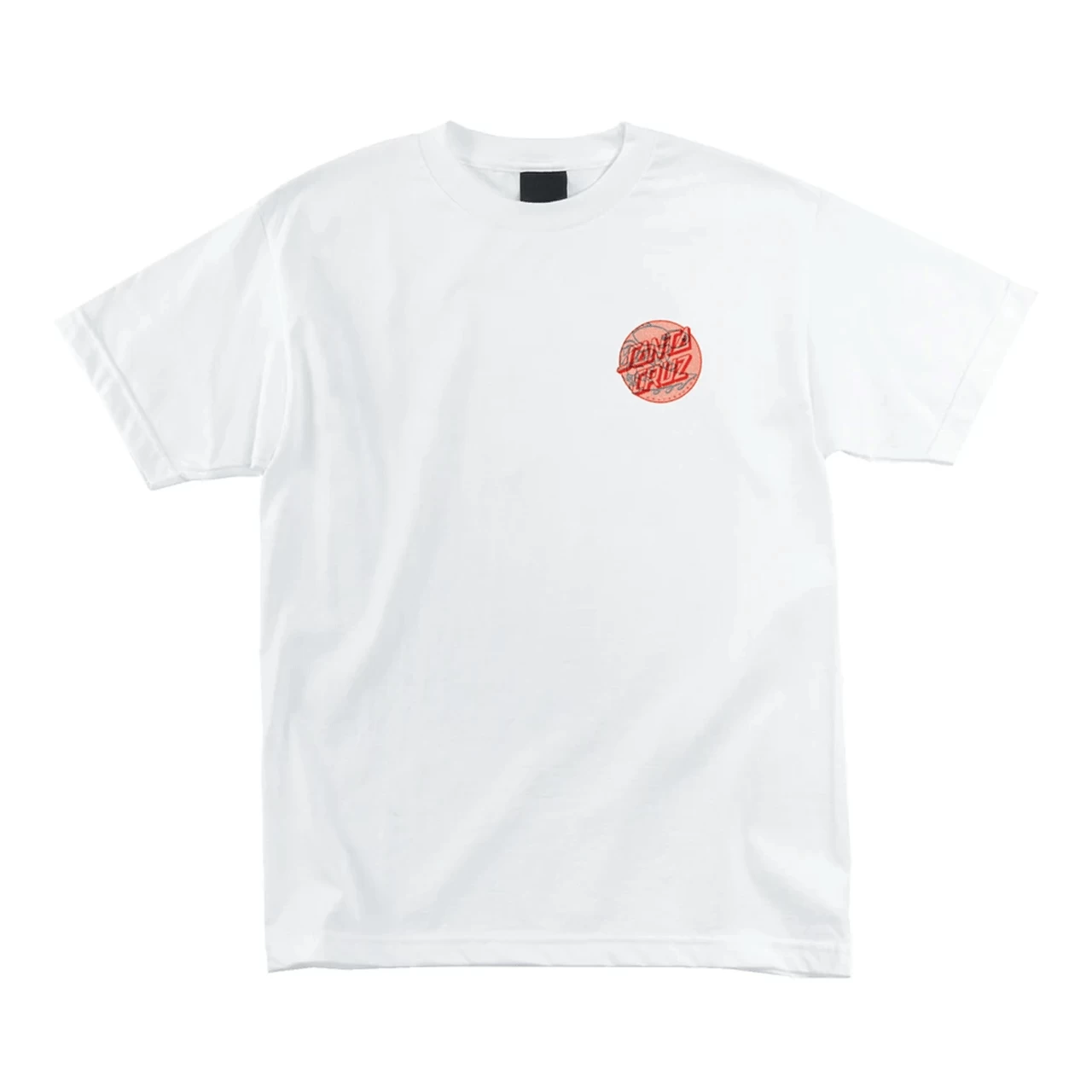 Regular fit short sleeve 6 oz. jersey t-shirt with small front and large back Santa Cruz Decoder Slasher logo prints; front print changes from Santa Cruz Dot to Slasher face, back print changes from original Slasher to Bone Slasher using included decoder lens hangtag. Art by Jim Phillips Sr.