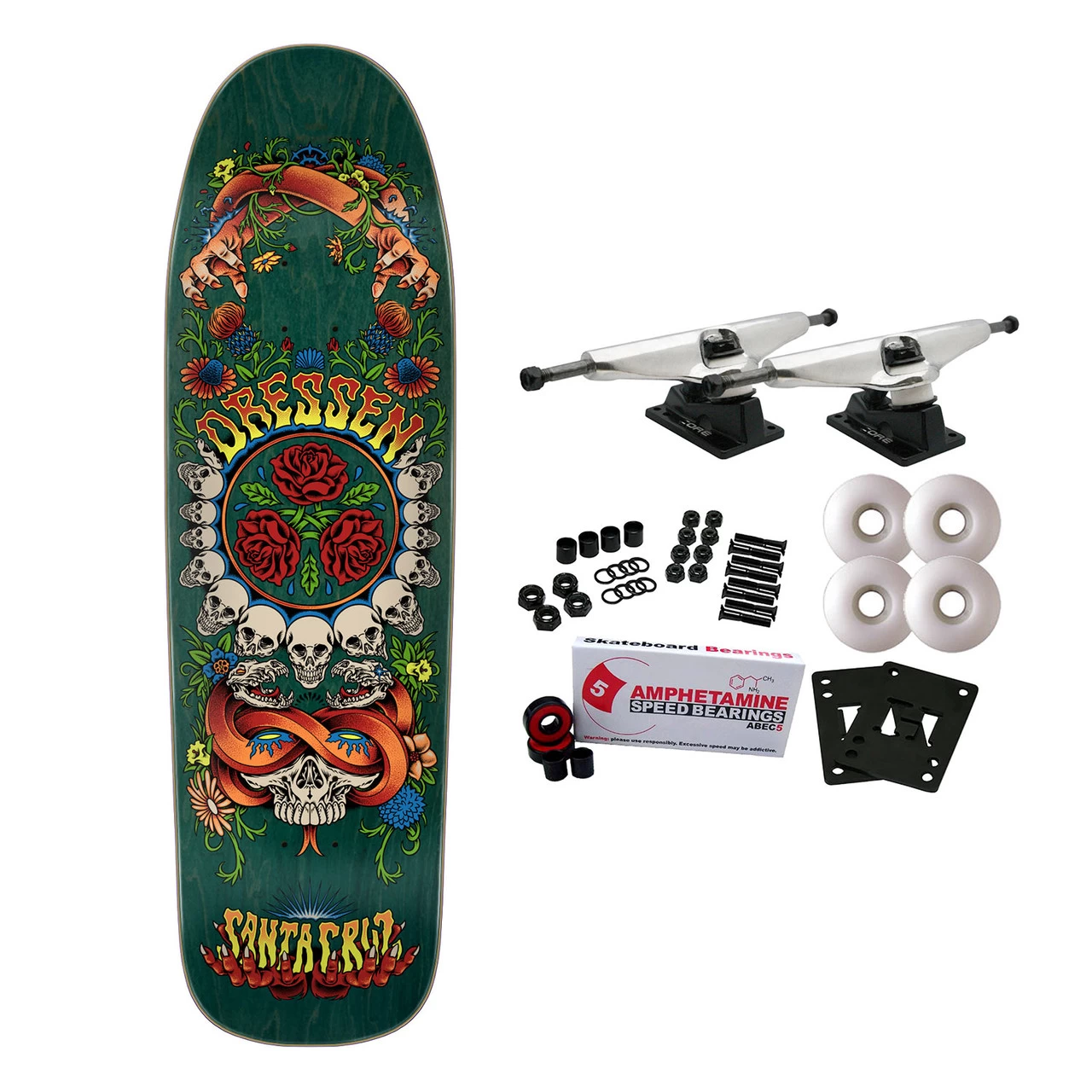 Santa Cruz Skateboards Eric Dressen Rose Crew Three custom Pro shaped deck with spot matte graphic art. 7 ply North American Maple pressed individually using epoxy – making a strong, responsive deck with long lasting pop and consistent concave and kick. Measures 9.31″ x 32.36″ with a 14.6″ wheelbase. Comes with Core trucks, 58mm 97A wheels, Amp abec 5 bearings, Black Diamond Griptape, risers, and hardware. Core trucks are light weight and feature heavy duty aluminum with grade 8 steel kingpins and axles, as well as USA made bushings and pivot cups. 58mm 97A are the perfect wheels for both street and park skating. Like the name states, Amp bearings are stimulants for your wheels! Light synthetic oil, Delrin Crowns, and Rubber Serviceable Shields are a few of the things that makes these bearings one of the best Abec 5 rated bearings on the market. Arrives un-assembled which allows for customization and a feeling of accomplishment. Skaters love building their boards! Easy to assemble!
