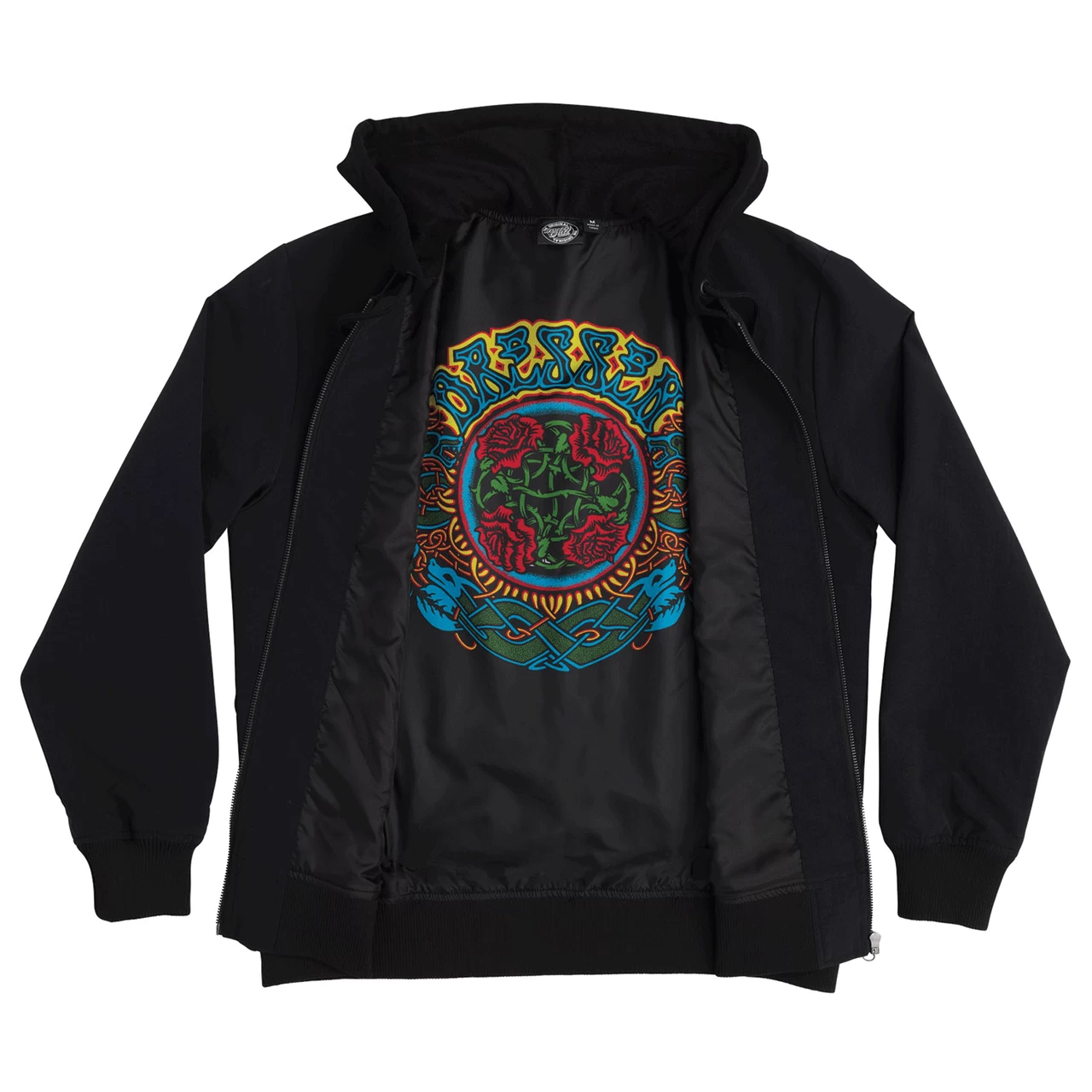 Roll up and stay warm in the latest jackets and apparel from Santa Cruz Skateboards. The new Santa Cruz Dressen Roses Dot men’s custom-knitted, hooded bomber jacket features drawstring hood, Santa Cruz Dressen strip logo on hood , custom woven Santa Cruz Strip label on right pocket and inside back Dressen Roses Dot screen printed in soft hand ink. Santa Cruz has been manufacturing iconic skateboards and apparel since 1973. Innovative skateboards and artwork from the beginning ’til the end.