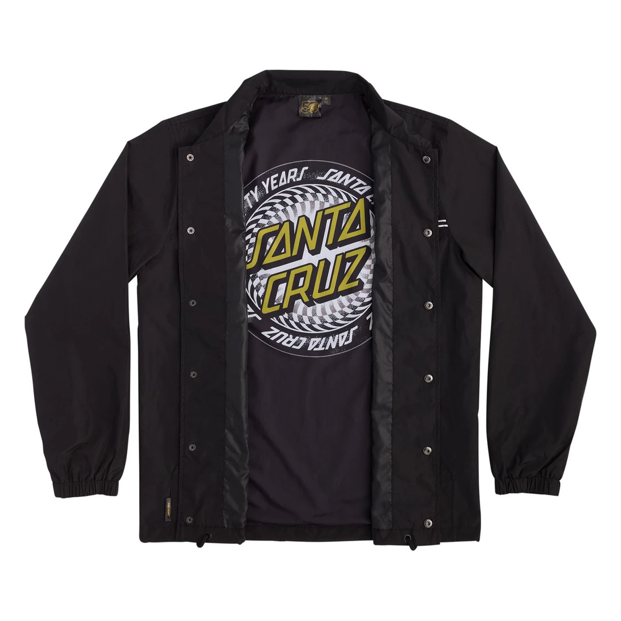Roll up and stand out in the latest jackets and apparel from Santa Cruz Skateboards. The new Odyssey men’s custom coach jacket features logo snaps, Odyssey screen print on left side and sublimated artwork at interior back and Santa Cruz 50th woven label at right side of kangaroo pocket. Santa Cruz has been manufacturing iconic skateboards and apparel since 1973. Innovative skateboards and artwork from the beginning ’til the end.